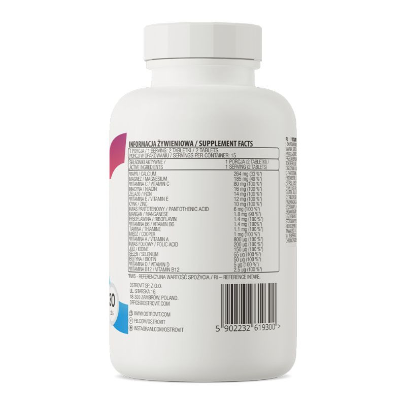 Sais de magnésio do ácido cítrico, carbonato de cálcio, agente de volume: celulose microcristalina; maltodextrina, ácido L-ascórbico, amido, diglicinato de ferro (II), picolinato de zinco, antiaglomerante: sais de magnésio de ácidos graxos; acetato de DL-alfa tocoferila, antiaglomerante: dióxido de silício; hexanicotinato de inositol, bisglicinato de manganês, L-selenometionina, bisglicinato de cobre, acetato de retinila, D-pantotenato de cálcio, colecalciferol, riboflavina, cloridrato de piridoxina, cloridrato de tiamina, ácido pteroilmonoglutâmico, iodeto de potássio, D-biotina, cianocobalamina.