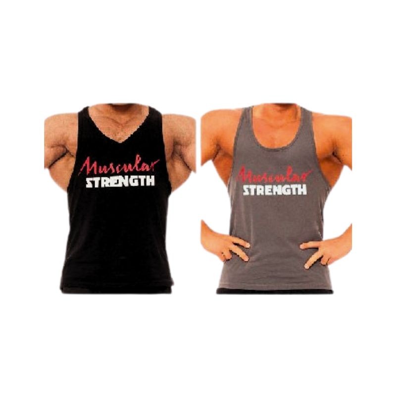 Na Foto é o modelo Cinza embaixo no lado Direito. Trata-se de uma Camisola de Bodybuilding com Alças Extreme, para uso em treino ou casual, com o logo Muscle Strenght na Frente.