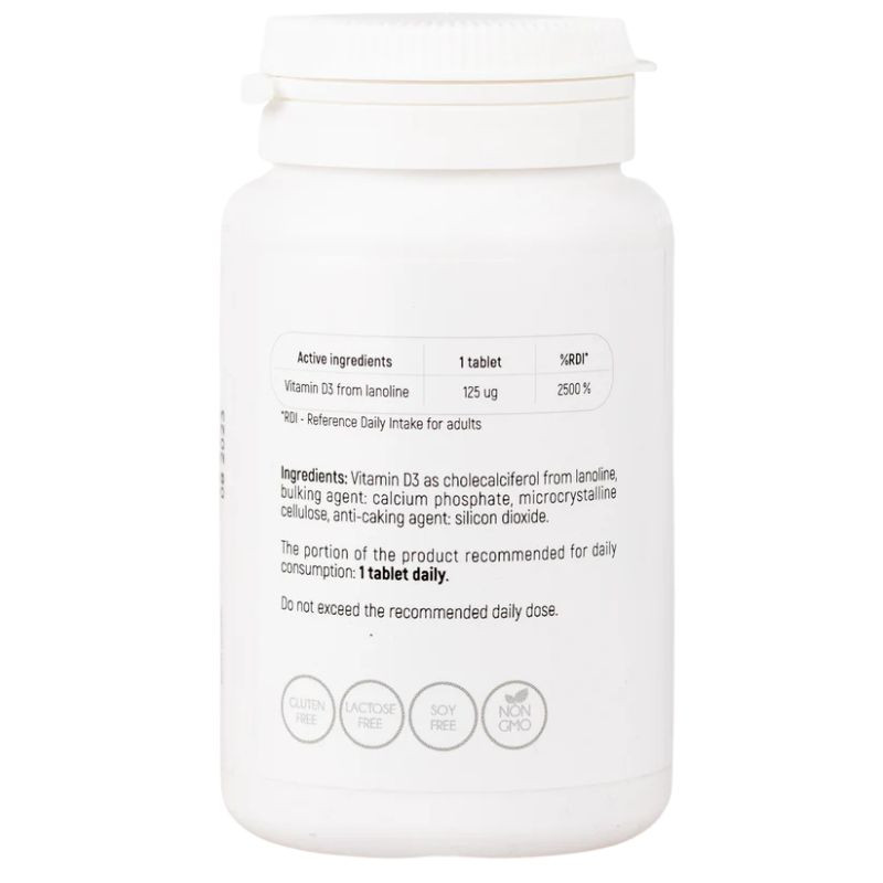 A vitamina D3 promove a absorção do cálcio e fósforo, essenciais para ossos fortes. Apoia o sistema imunitário, ajuda na função muscular e participa em processos de divisão celular. A dose de 5000UI é adequada para suplementação preventiva prolongada ou para corrigir défices moderados.